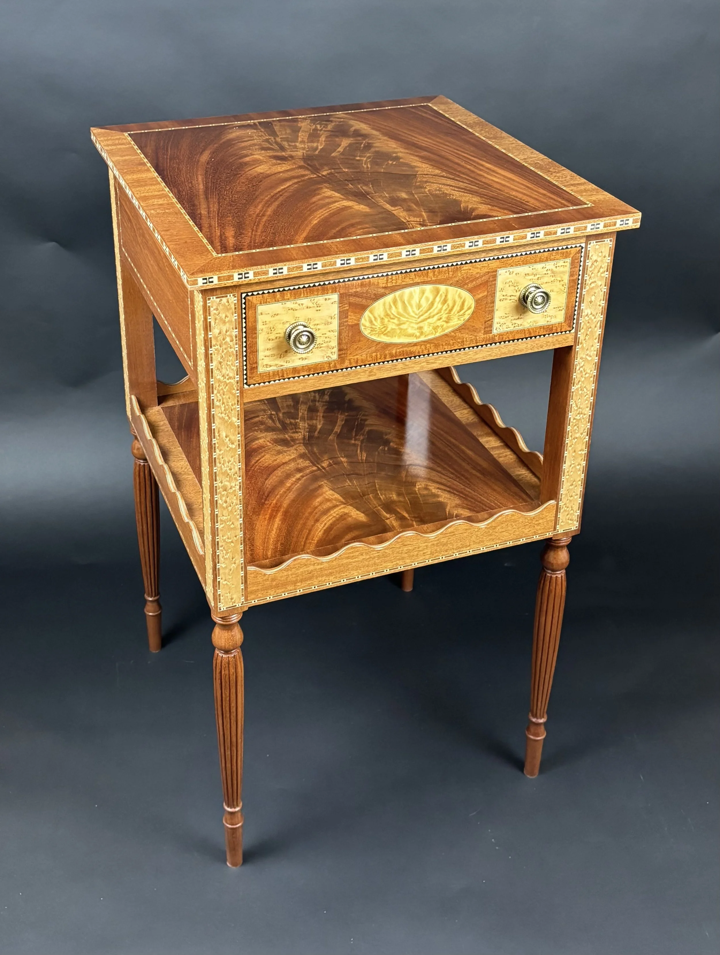 An elaborately decorated federal style lady’s worktable made in central American Mahogany with crotch mahogany, birdseye maple, and birch crotch veneer and multiple bandings. The form is traditional but the design of the decoration is my own interpretation of the federal style. The legs are turned and reeded and also of my own design.